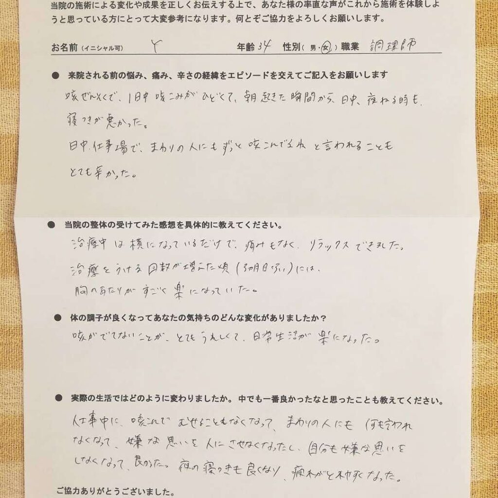 日中仕事場でまわりの人にもずっと咳込んでるねと言われることがとても辛かった。 - 当院の整体を受けてみた感想を具体的に教えてください。