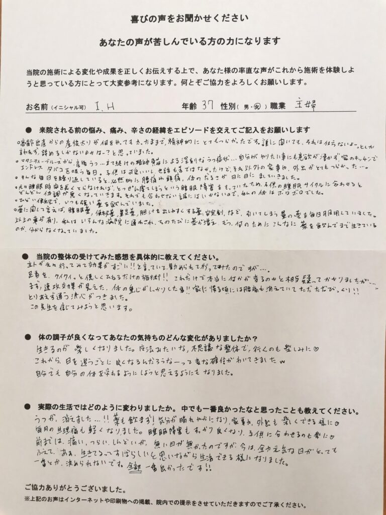 A.うつが消えました!!薬も飲まず!気分が晴れやかになり家や外出も楽しくできるように。