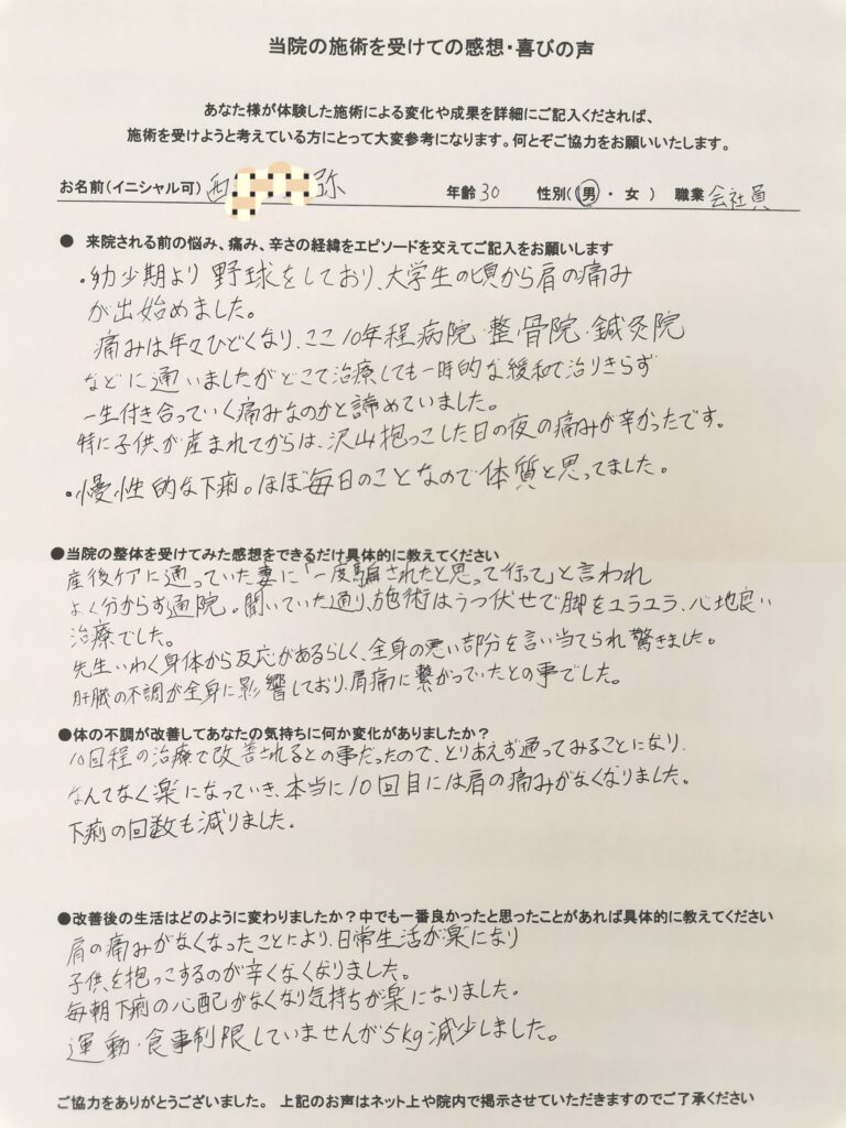 肩の痛みがなくなったことにより、日常生活が楽になり、子供を抱っこするのが辛くなくなりました。
