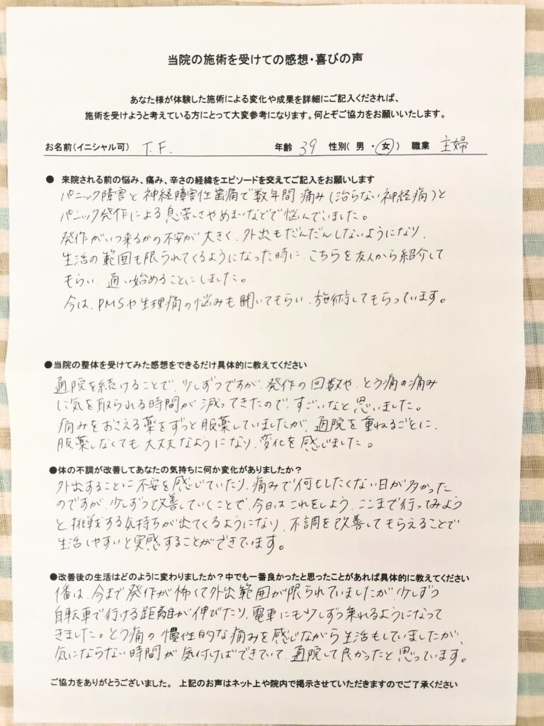 A.パニック障害と神経障害性歯痛で数年間痛み(治らない神経痛)とパニック発作による息苦しさやめまいなどに悩んでいました。