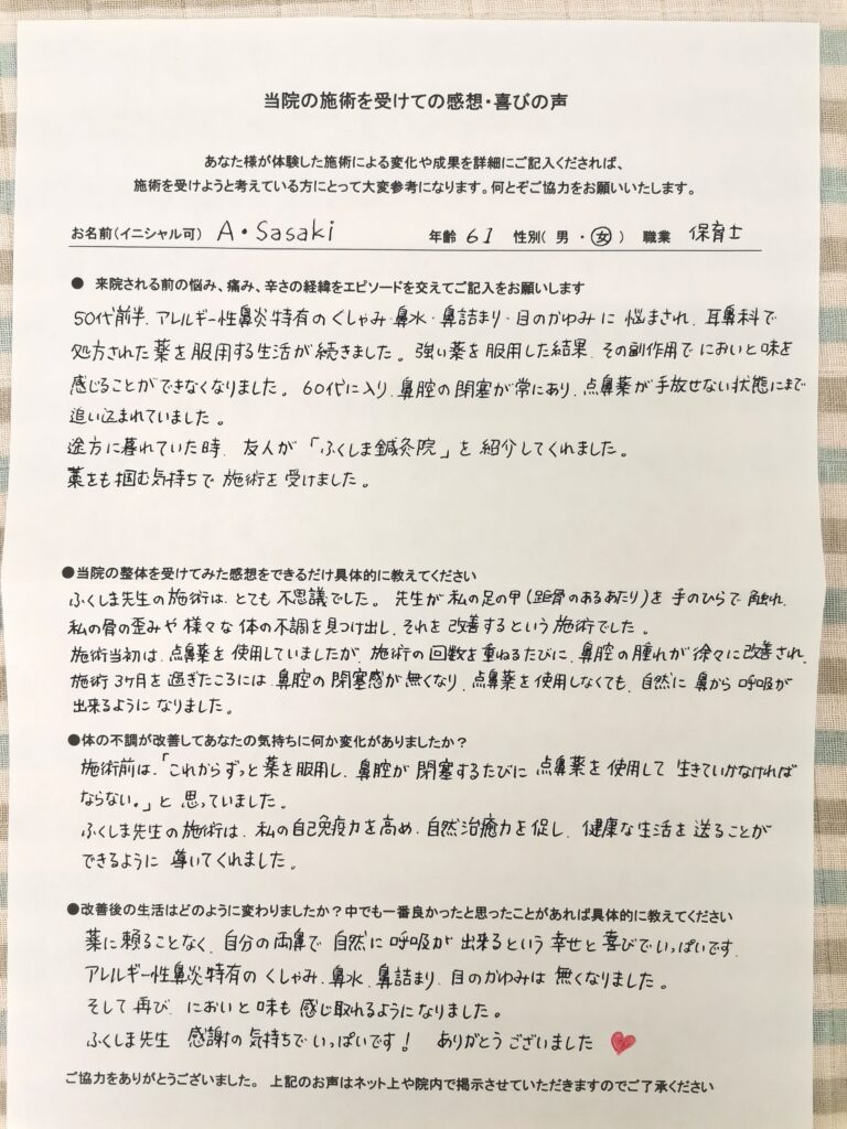 施術当初は点鼻薬を仕様していましたが、施術の回数を重ねるたびに鼻腔の腫れが徐々に改善され、施術3ヶ月を過ぎたころには鼻腔の閉塞感が無くなり点鼻薬を仕様しなくても鼻から呼吸が出来るようになりました。