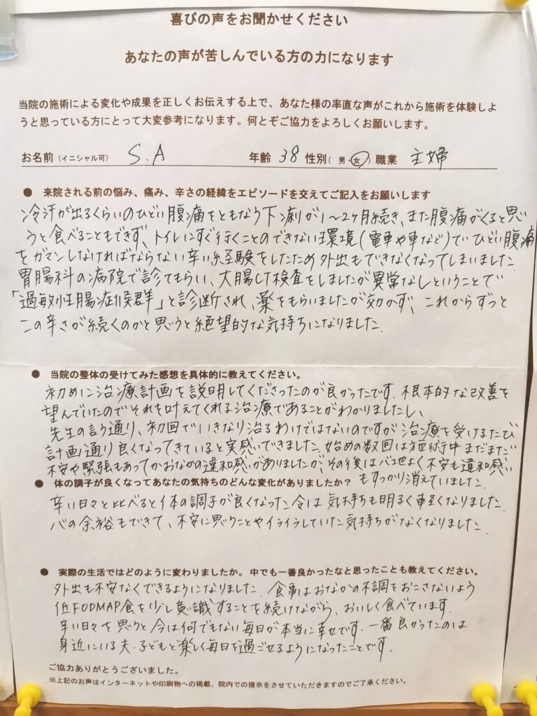 胃腸科の病院で診てもらい、大腸CT検査をしましたが、以上なしということで「過敏性腸症候群」と診断され、薬をもらいましたが効かず、これからずっとこの辛さが続くのかと思うと絶望的な気持ちになりました。 - 当院の整体を受けてみた感想を具体的に教えてください。