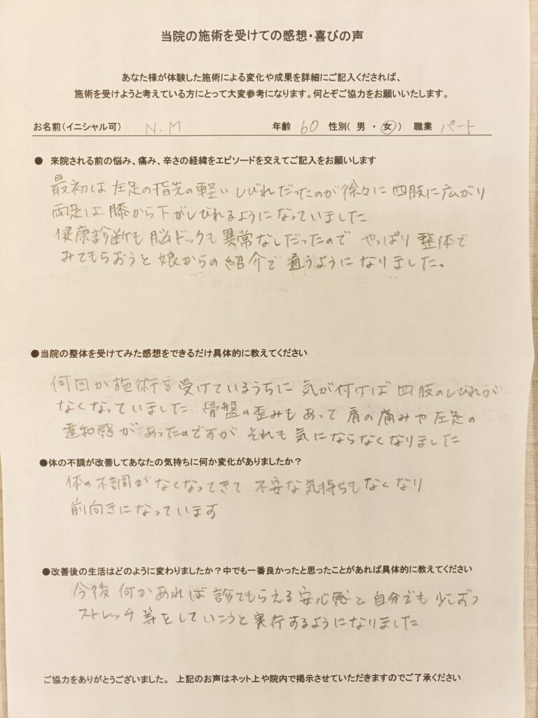 A.何回か施術を受けてるうちに気が付けば四肢のしびれがなくなっていました。